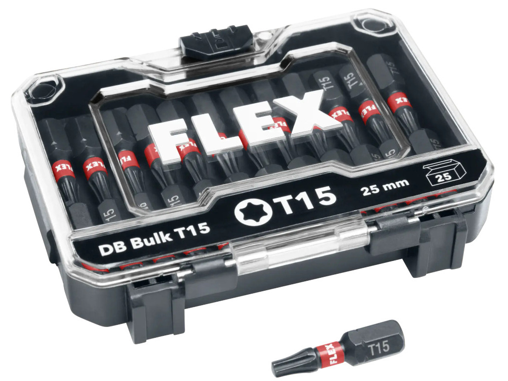 Flex DB Bulk T15 je sada kvalitních torzních bitů s Torx hlavou na montáž šroubů v kombinaci s klasickým nebo rázovým šroubovákem.