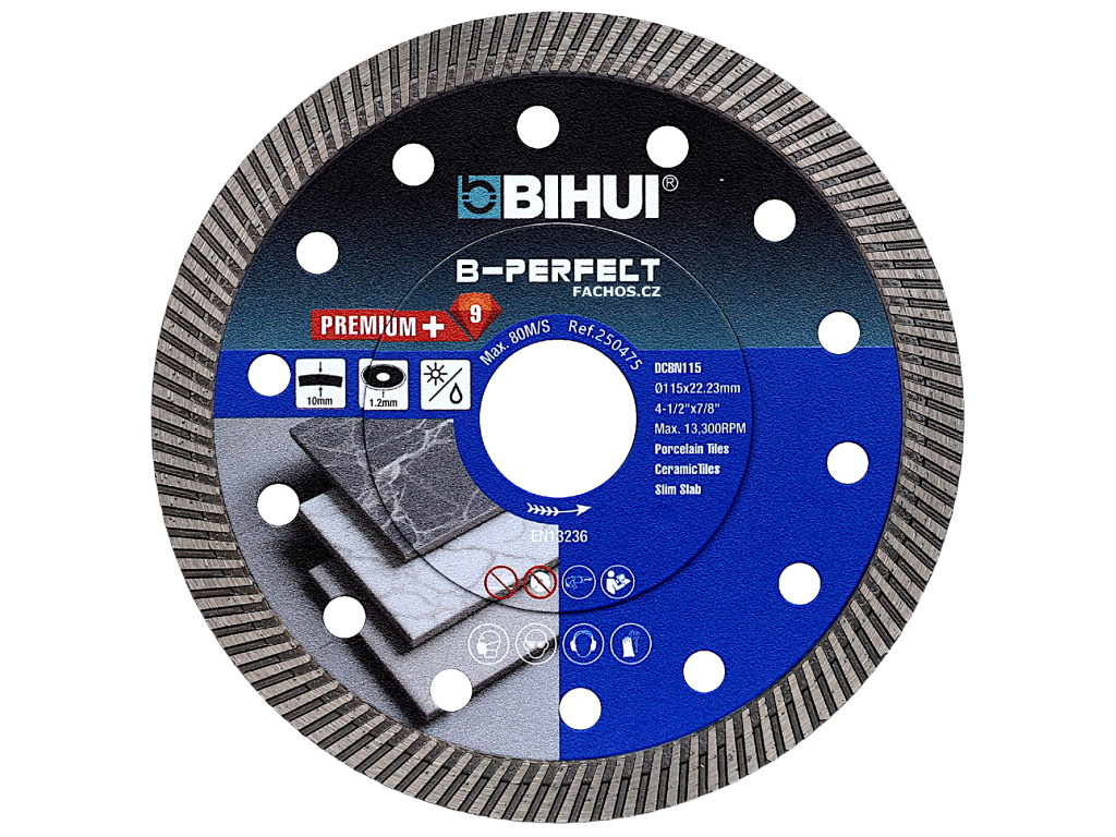 Bihui B-Perfect je diamantový řezný kotouč na dělení obkladů, dlažeb, žuly a mramoru do tloušťky 20mm. Kotouč je rychlý a překvapivě čistý v neglazovaných materiálech, zejména pokud jej použijete s vodním chlazením Spray. Otřepení hrany po řezu snadno začistíte padem Bihui DPP #100 nebo lamelovým kotoučem Bihui Flap 120.