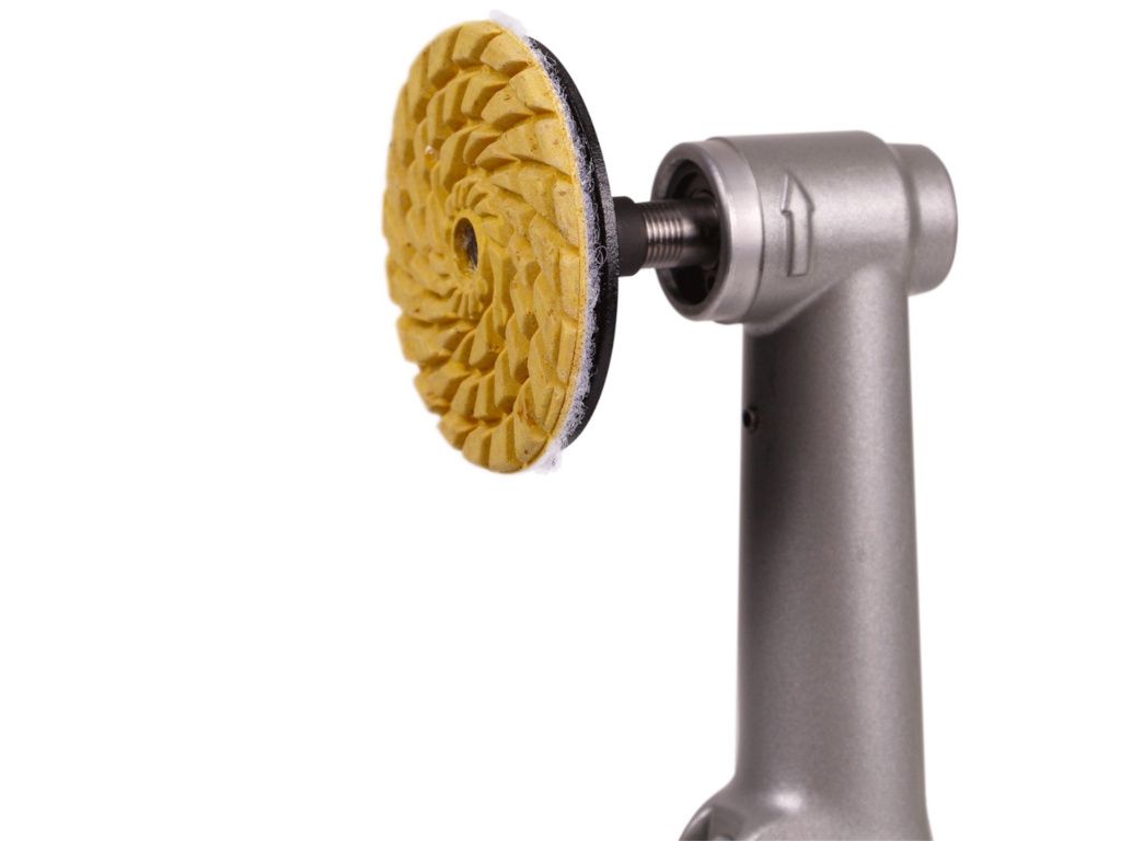 K adaptéru je dodáván kovový disk opatřený suchým zipem na uchycení brusných a leštících padů. Velkou výhodou unašeče je středový šroub, který brání pohybu padů do stran a hravě si poradí s otáčkami do 6000/min..