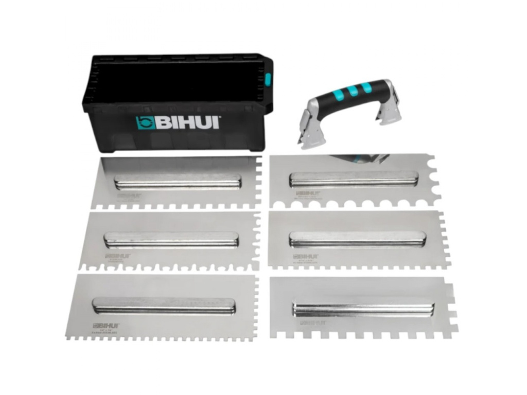 Sada profesionálních rychloupínacích zubových hladítek se šesti typy zubů, díky kterým si poradíte s montáží různých typů a formátů obkladů, dlažeb nebo kamene.